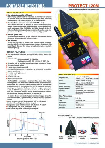 Protect 1206i – це новий клас пристроїв протидії системам спостереження. На відміну від всіх типових пошукових приладів він здатний виявити сучасні “приховані” закладки, які використовують такі протоколи як Bluetooth і Wi-Fi на великій відстані. Такі закладки, особливо типу Bluetooth, практично не виявляються за допомогою звичайних детекторів РЧ через їх дуже низьку потужність передачі і спеціальний тип модуляції. Protect 1206i використовує окремий канал з механізмом попереднього вибору високих (2,4/5 ГГц) частот для виявлення і локалізації Bluetooth і Wi-Fi з набагато більш високою чутливістю. Пристрій також потім обробляє демодульований сигнал, щоб ідентифікувати, який було виявлено протокол. Крім того, пристрій може виявляти всі “класичні” закладки і аналізувати їх на наявність кореляції, посилаючи звукові імпульси, а також інші цифрові передачі на стандартній відстані (GSM, 3G, DECT і т. д.).