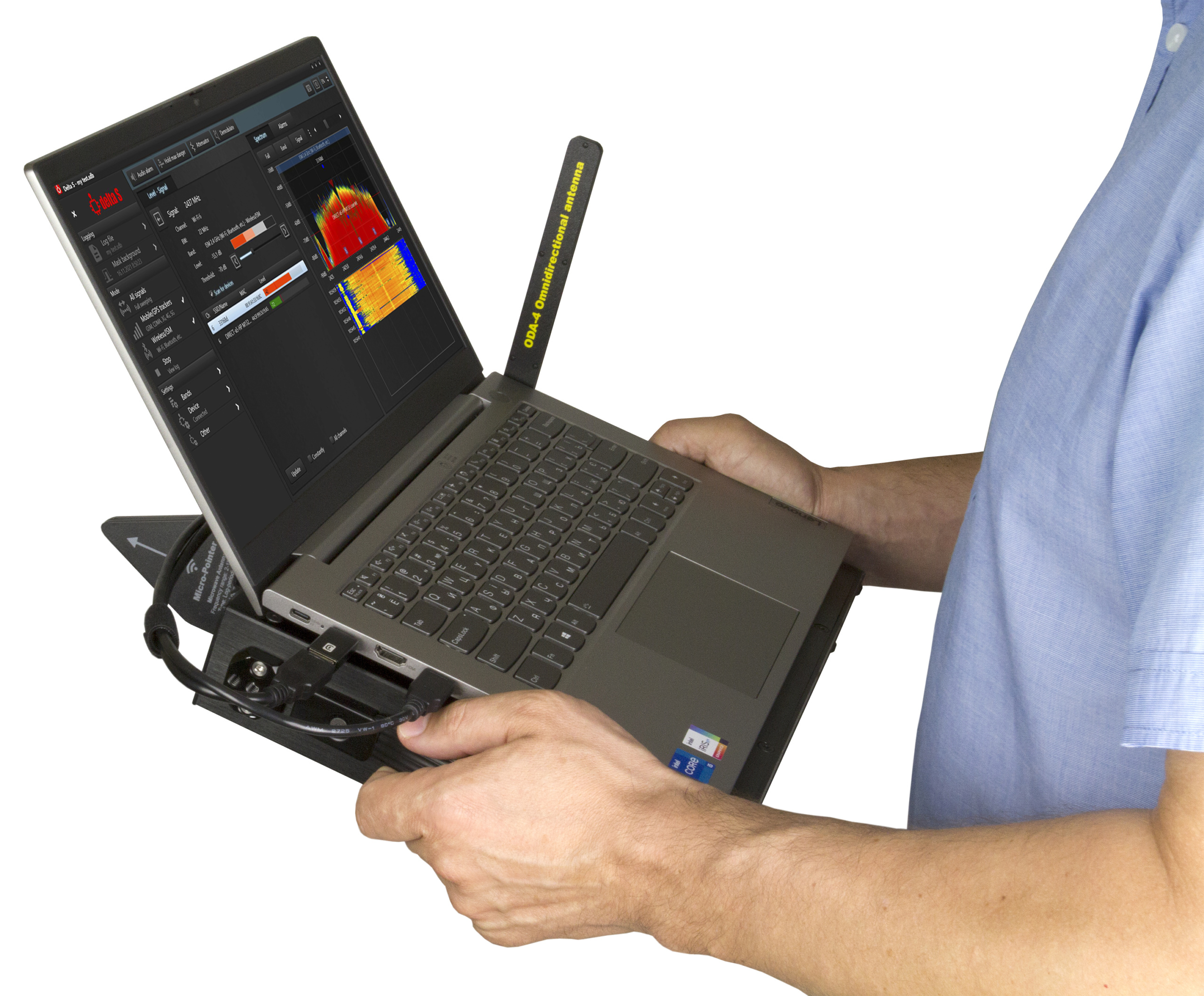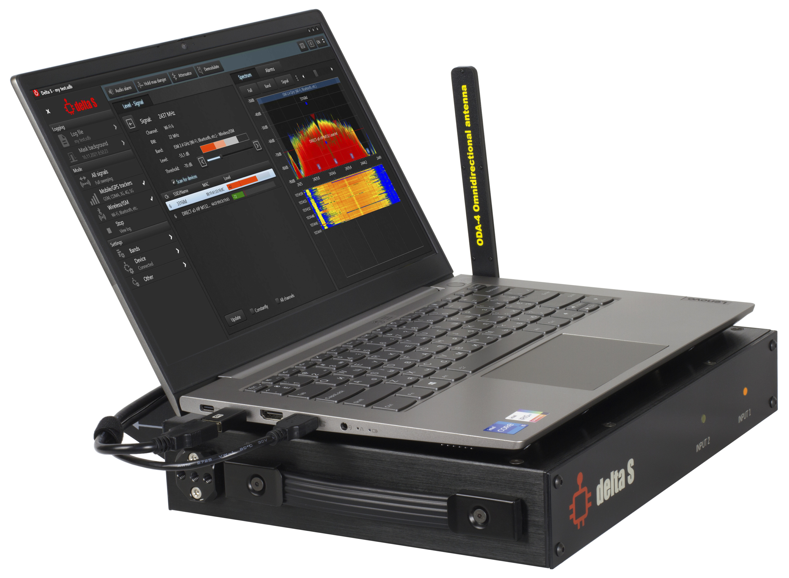 - Знаходить та ідентифікує закладні пристрої, що використовують цифрові стандарти GSM, 3G, 4G/LTE, 5G, Bluetooth, Wi-Fi, DECT та інші стандарти в діапазоні до 6 ГГц (12 ГГц)