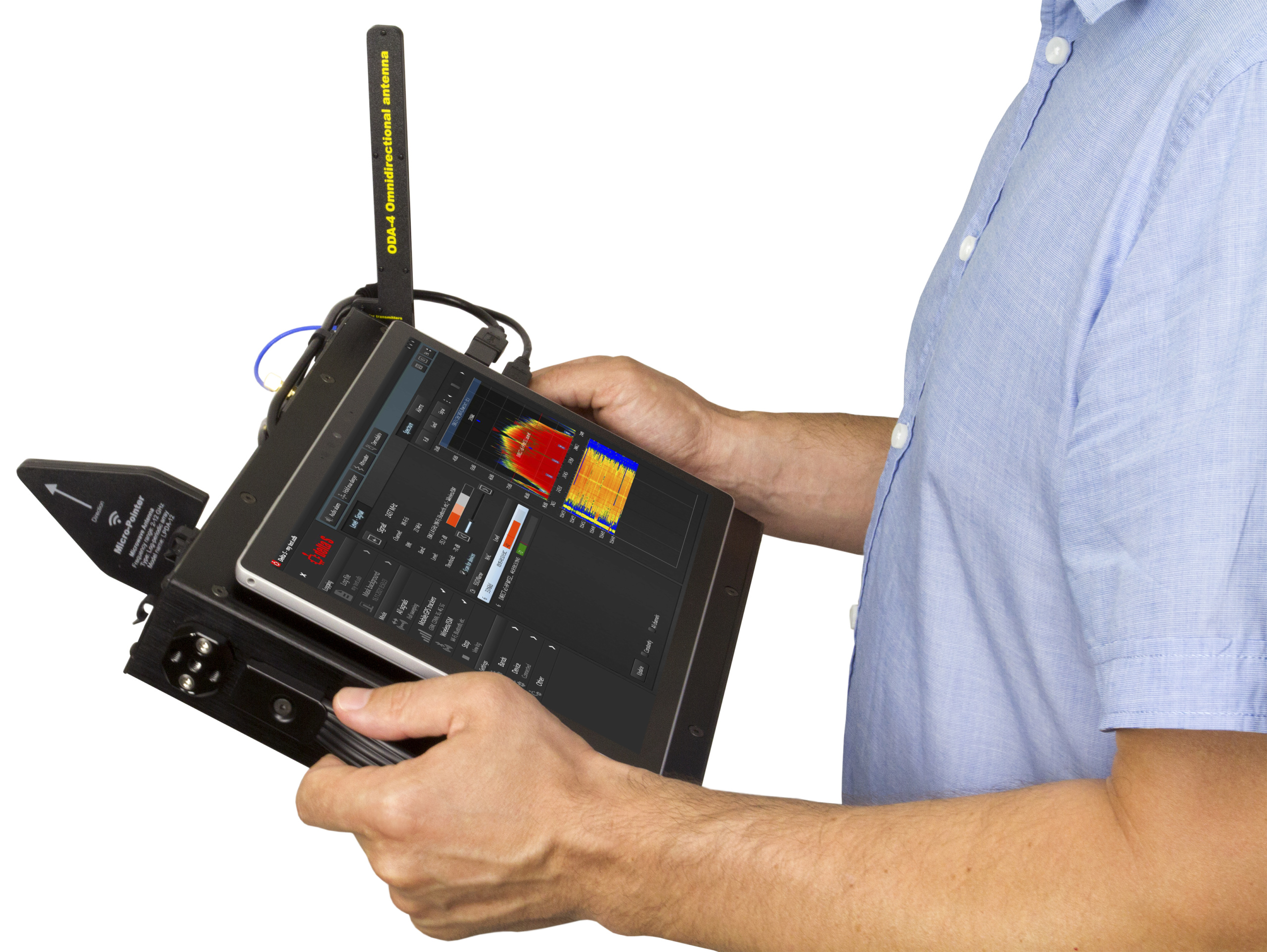 - Система працює з ноутбуком або планшетом та живиться від нього. Надійно з’єднується з ноутбуком або планшетом щоб переміщуватись під час пошуку та локалізації. Має зручну магнітну система кріплення ноутбука / планшета до головного блоку