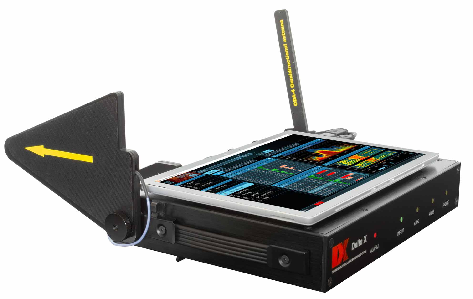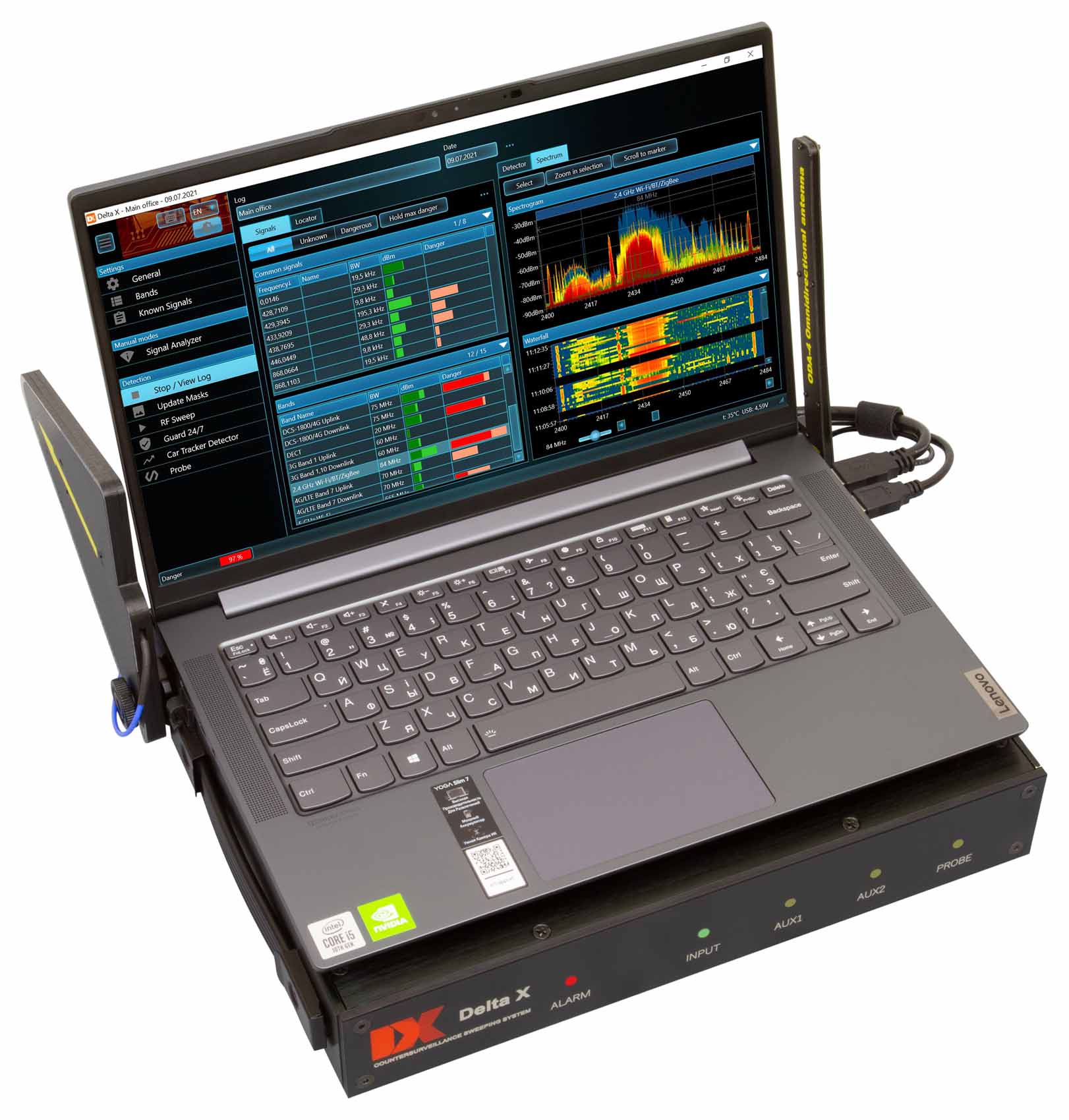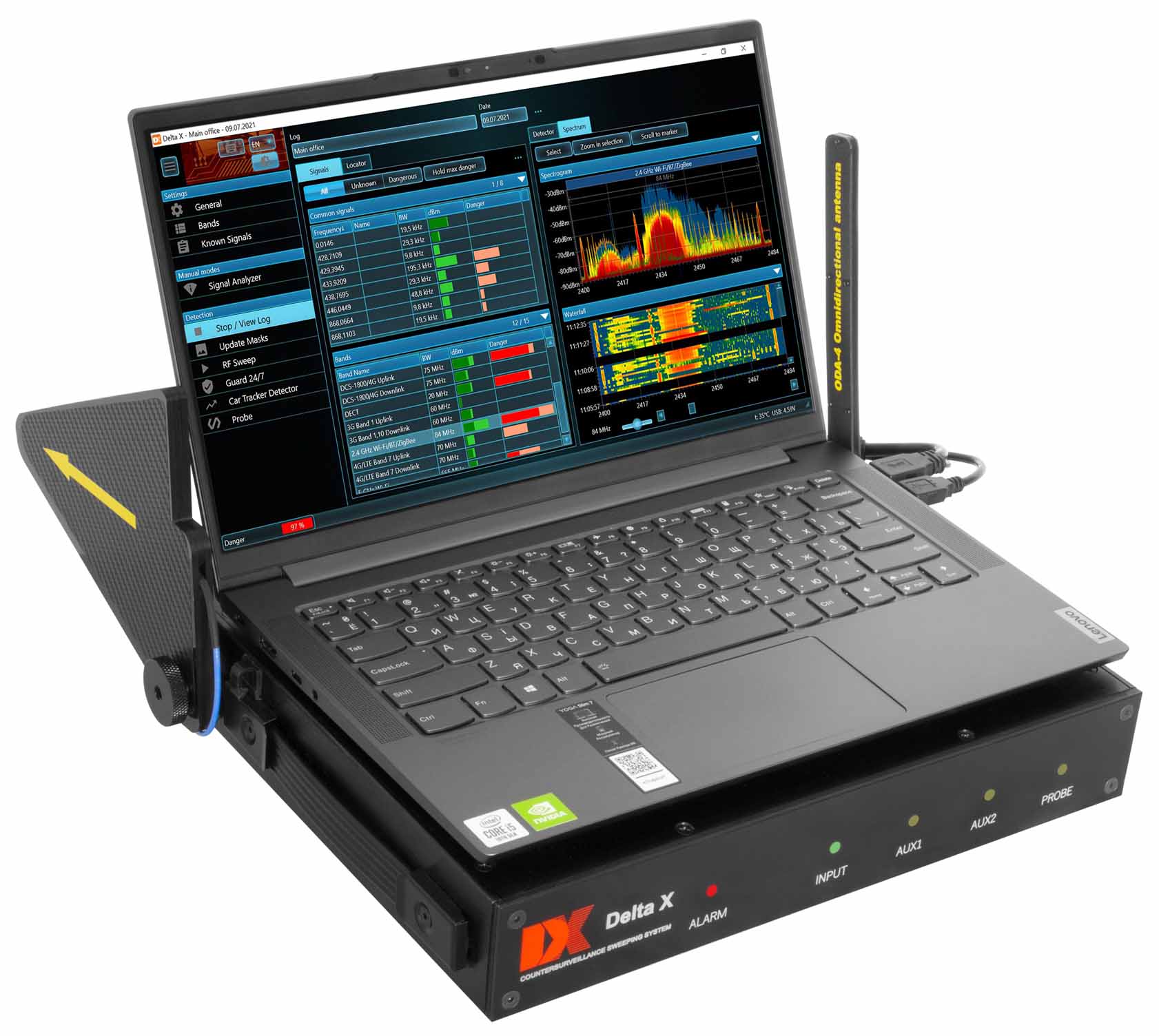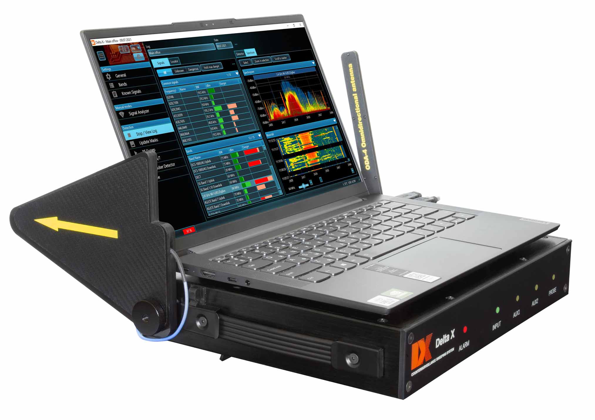 - Знаходить та ідентифікує закладні пристрої, що використовують цифрові стандарти GSM, 3G, 4G/LTE, 5G, Bluetooth, Wi-Fi, DECT та інші стандарти в діапазоні до 6 ГГц (12 ГГц)