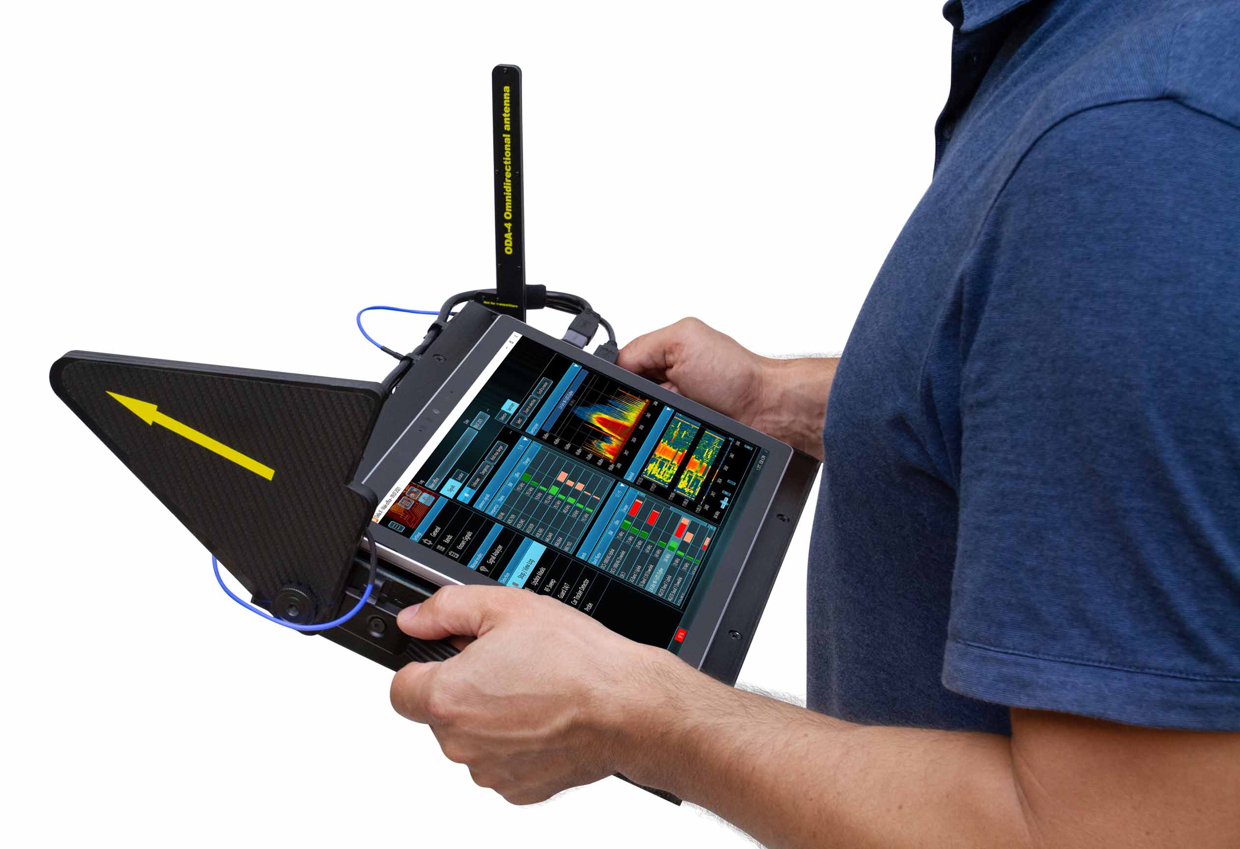 - Система працює з ноутбуком або планшетом та живиться від нього. Надійно з’єднується з ноутбуком або планшетом щоб переміщуватись під час пошуку та локалізації. Має зручну магнітну система кріплення ноутбука / планшета до головного блоку.