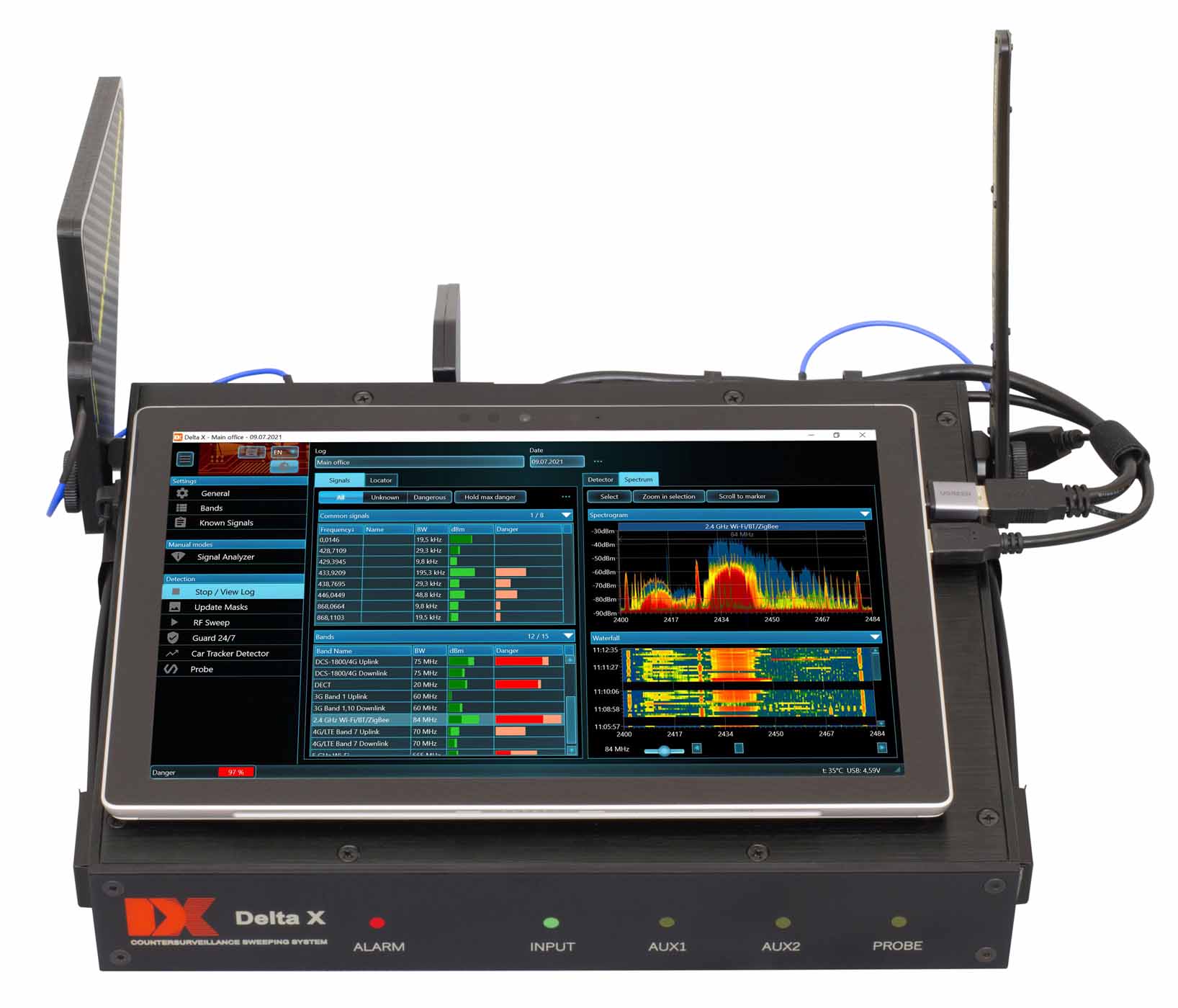 - Виявляє радіочастотні глушники (блокіратори, джаммери) на всіх діапазонах, включаючи діапазони мобільного зв’язку типу uplink та downlink, діапазони Глобальної Навігаційної Супутникової Системи (GPS, GLONASS, GALILEO, та ін.), Wi-Fi/Bluetooth, і т.д..